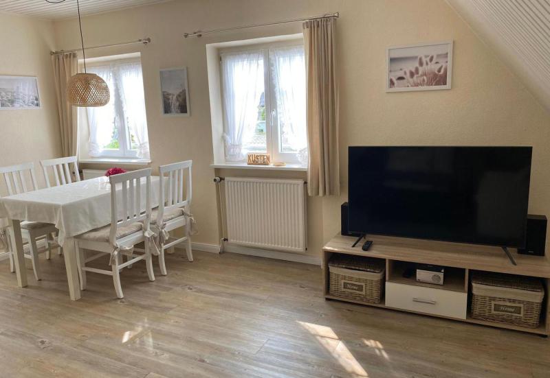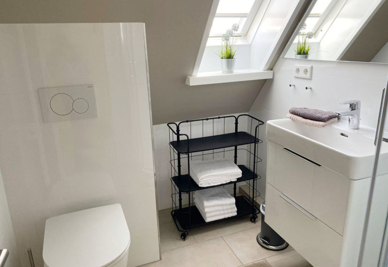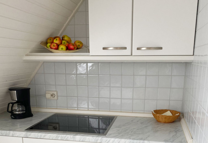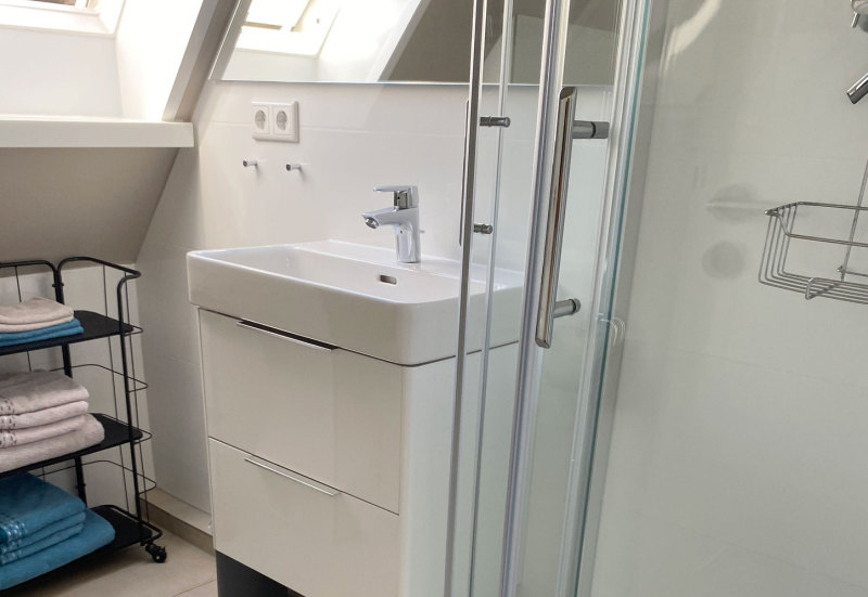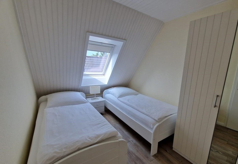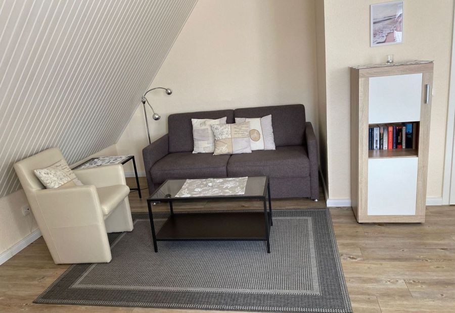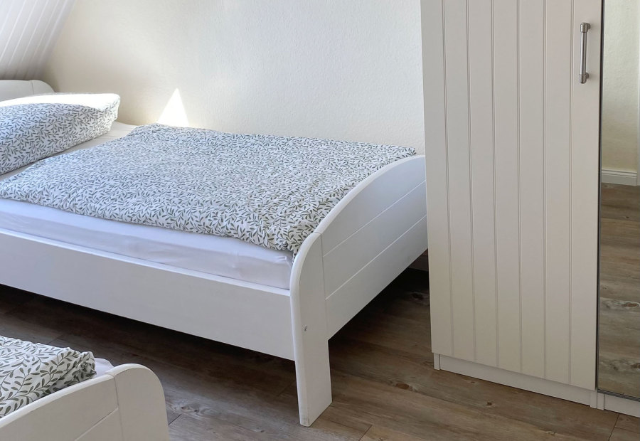 Unsere gemütliche Dachgeschoss-Wohnung D1 besticht mit charmanten Schrägen und moderner Möblierung. Sie ist mit zwei Einzelbetten und einer Ausziehcouch ausgestattet und somit für 2-4 Personen geeignet.
